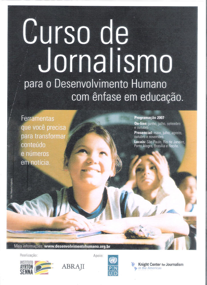 Curso promovido pelo Instituto Ayrton Senna para qualificar a cobertura jornalística da área social, em parceria com a Abraji (Associação Brasileira de Jornalismo Investigativo) e apoios do Pnud (Programa das Nações Unidas para o Desenvolvimento) e do Knight Center for Journalism in The Americas (EUA).